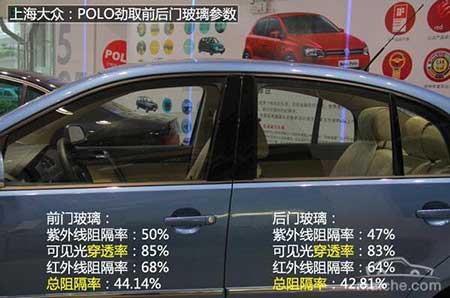 經(jīng)過(guò)測(cè)試,POLO勁取的前門玻璃參數(shù)為:紫外線阻隔率50%、可見(jiàn)光穿透率85%、紅外線阻隔率68%,總阻隔率44.14%。后門玻璃的參數(shù)為:紫外線阻隔率47%、可見(jiàn)光穿透率83%、紅外線阻隔率64%,總阻隔率42.81%